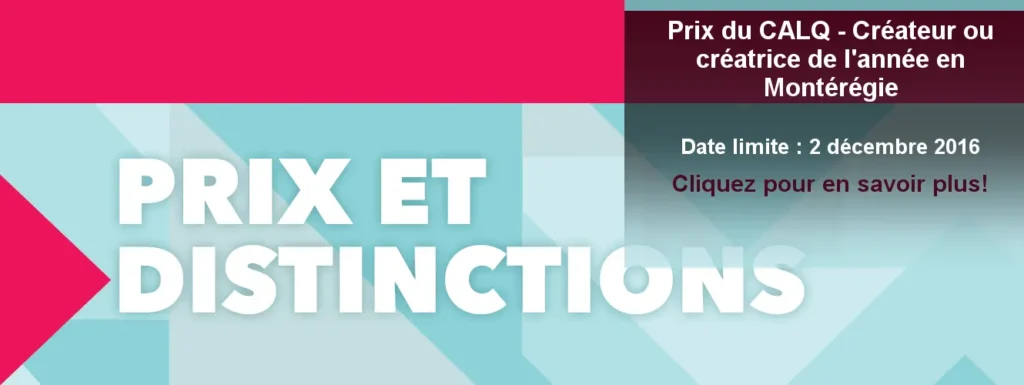 Le Conseil des arts et des lettres du Québec (CALQ), en collaboration avec Culture Montérégie, lance l’appel de candidatures pour le Prix du CALQ – Créateur ou Créatrice de l’année en Montérégie. Ce prix, assorti d’un montant de 5 000 $, vise à reconnaître un artiste ou un écrivain qui se démarque par le dynamisme de son parcours et l’excellence de son œuvre. Le prix sera attribué lors d’une cérémonie organisée par Culture Montérégie en mars 2018.