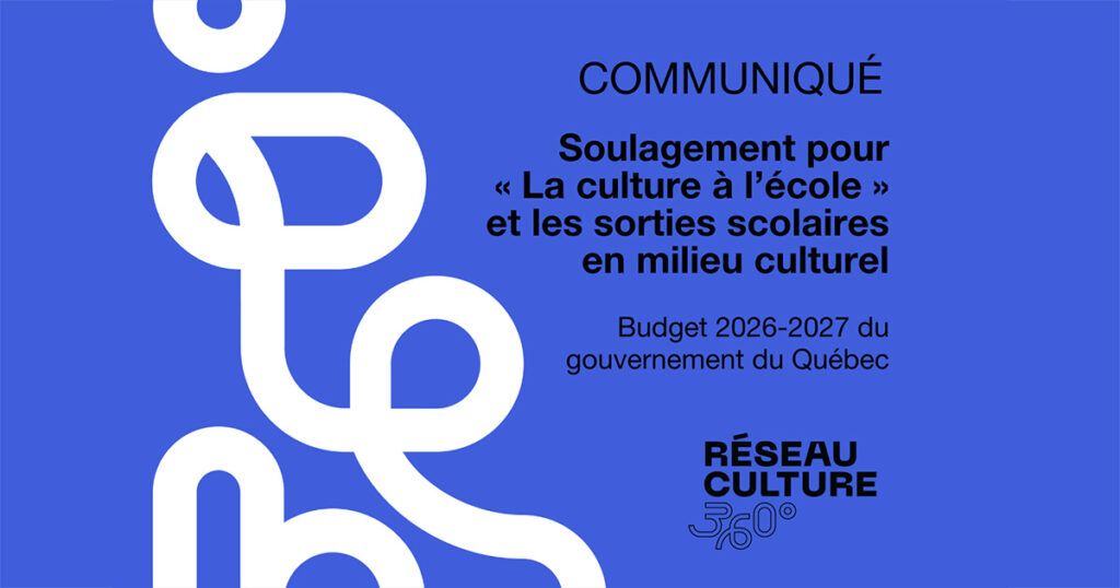 Le Réseau Culture 360°, qui regroupe les conseils régionaux de la culture du Québec, est soulagé de constater que le gouvernement du Québec renonce aux coupes envisagées dans le programme La culture à l’école et dans les sorties scolaires en milieu culturel, comme demandé par l’ensemble du milieu culturel. Par ailleurs, dans le contexte budgétaire actuel, le Réseau se réjouit de la bonification du financement des institutions muséales et de la consolidation du budget de la SODEC. Cependant, le Réseau constate l’absence de stratégies pour soutenir le financement privé en culture, de même que la stagnation du financement des conseils régionaux de la culture du Québec.