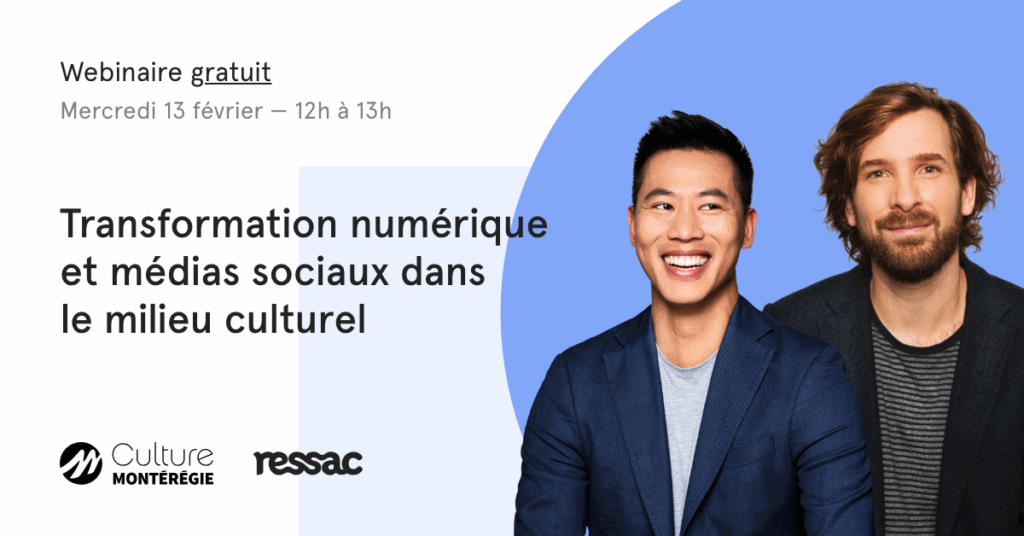Les 13 et 20 février prochains, nous vous proposons deux webinaires traitant de transformation numérique et de réseaux sociaux dans les milieux culturels et artistiques.